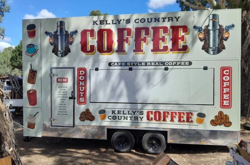 Enjoy delicious food and drinks from the "NED KELLY" coffee van selling delicious items such as coffee, biscuits, milkshakes, frappe, tea, donuts, soda, hotdogs & more